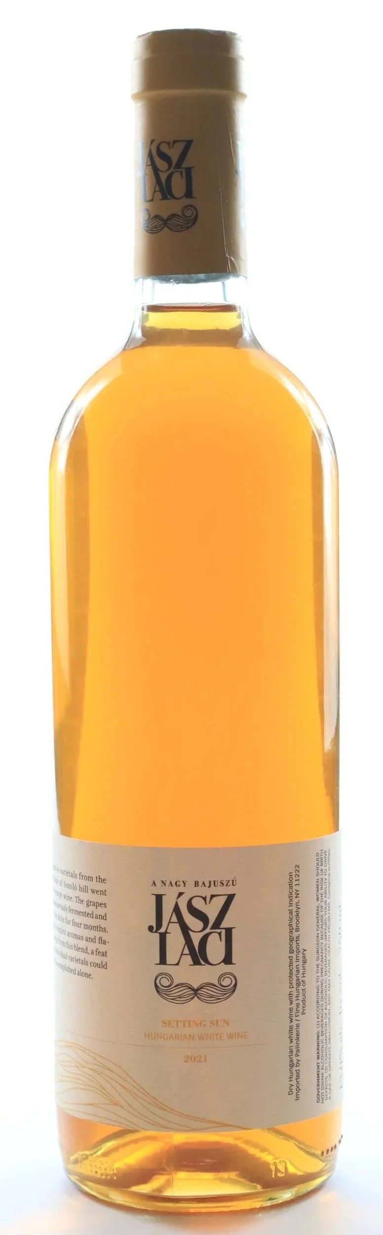 Jász Laci's "Setting Sun" is a rare blend of native varietals from Somló: Juhfark, Furmint, Sárfefér, Gohér, Járdovány, Olaszrizling and Zőldszilváni. The grapes were co-planted in a single vineyard on the western slope of Somló, and they were co-fermented. Fermentation was spontaneous with native yeasts in stainless steel tank without temperature control. The wine spent 30 days on the skins and remained on the lees until bottling. Unfiltered and unfined, certified organic, with no sulfur added.